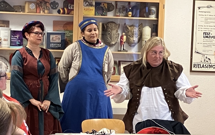 So sollen alle Menschen , die zu Junker´s Zeiten in der Burg gewohnt und gearbeitet haben dargestellt werden , als da wären: Knechte und Knappen, Mägde und Burgfräulein, ein Mönch , ein Bader , eine Köchin und so weiter. Eine bunt gemischte Gruppe in mittelalterlichen Gewändern , offen für alle Interessierten.