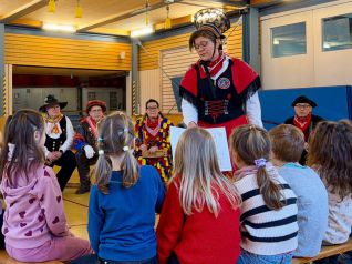 Zur Zeit sind die Narren des Narrenvereins Burg Rosenegg und der Röleizinger Weiber in den Kindergärten und Schulen unterwegs , um den Kindern die Rielasinger Fasnet zu zeigen.