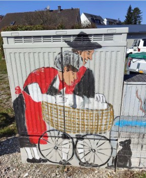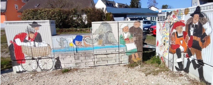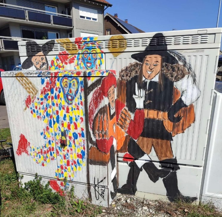 Ursula Knapp gestaltet seit geraumer Zeit die Stromkästen in der Gemeinde mit bunten, kreativen Motiven, was allemal schöner ist als das ewige Grau. Und immer, wenn man jetzt durch den Kreisverkehr Nord fährt lacht einem die Fasnet an!