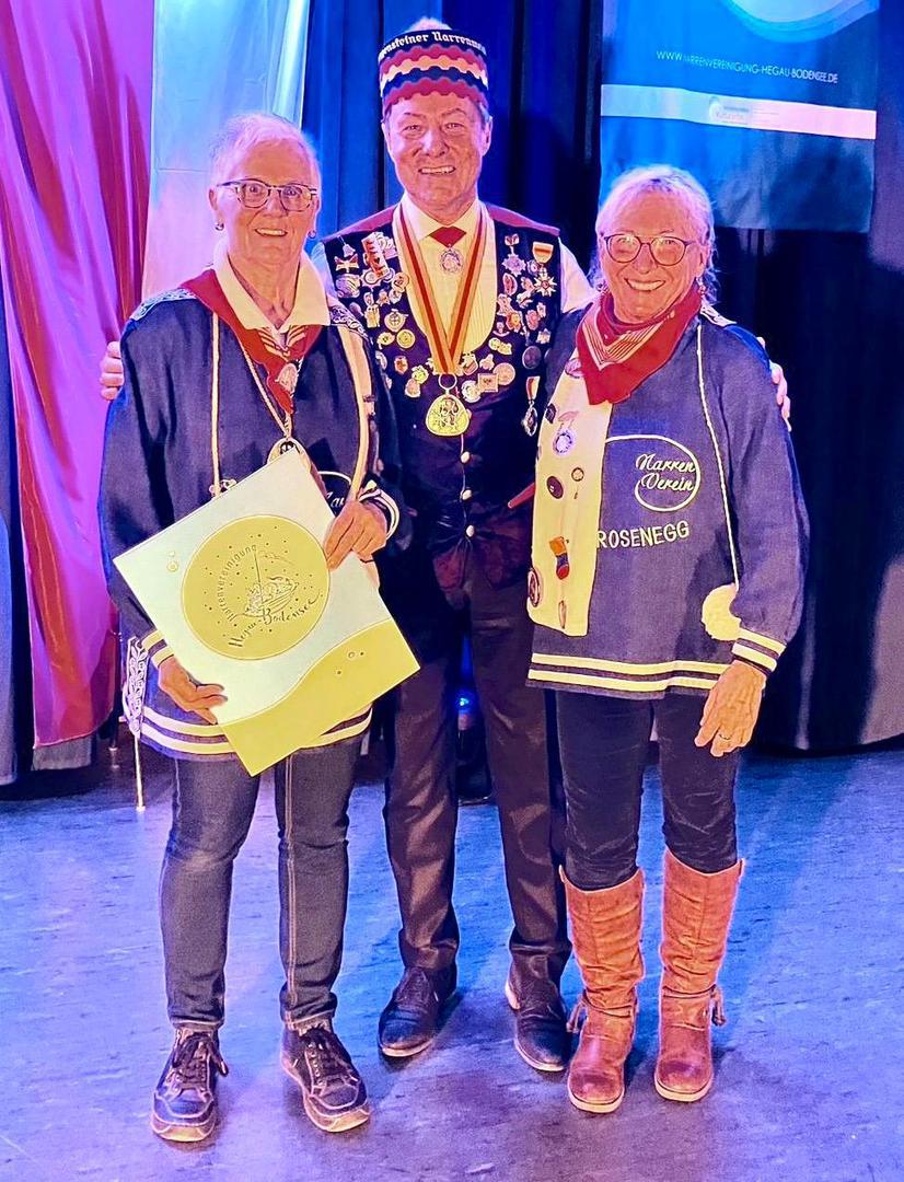 Die Zweite Obristin auf dem Foto ist Dagi Wenzler-Beger, die schon 2019 die Ehrung zusammen mit ihrem verstorbenen Mann Bernhard „Bögiy“ Beger erhielt. Beide zählten viele Jahrzehnte zu den Stars auf der Narrenspiel Bühne. Dagi ist seit dreißig Jahren auch als Regisseurin der Narrenspiele tätig. Bögiy gründete 1979 die Hanselegruppe und war 19 Jahre lang ihr Gruppenleiter.