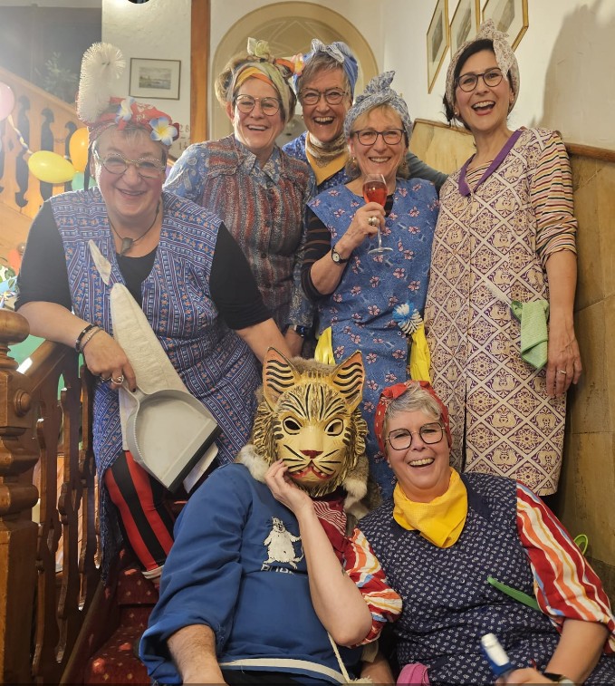 Zum Abschluss der fröhlichen Abends traten Ali Schoch , Monika Mock, Sandra Grubert, Marita Reitze-Fürst, Karin Busshard und Dagi Wenzler-Beger, die traditionelle „Wiebernummer“, als „Putzregiment“ auf und nahmen so manche Mißgeschicke, die an den Narrenspielen passiert waren auf die Schippe.