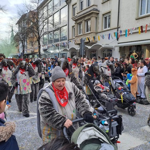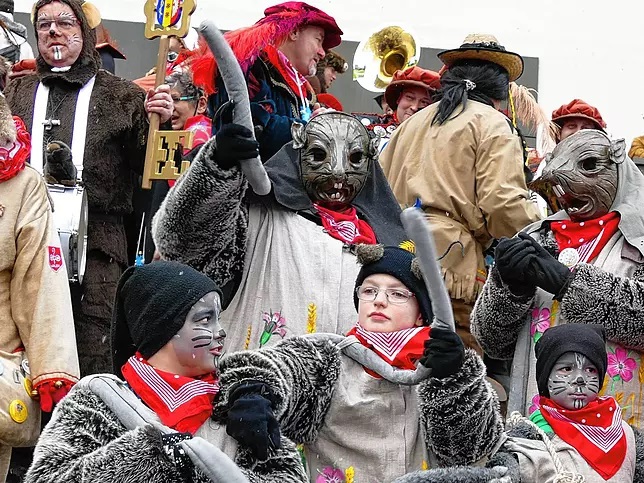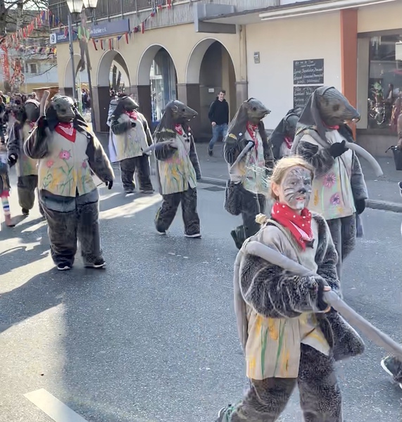 Herkunft: Aufgabe: Wie schon im Absatz „Wieso „Rattlinger“?“ beschrieben entstand die Figur Ratte aus dem unbeliebten Unkraut Kornrade. Sie tanzen mit der Gemeinde nach dem traditionellen Baumstellen am Schmutzigen Dunnschtig den Rattenmarsch. Bei den Umzüge verteilen auch sie Bonbons. Besonderes: Die Ratte verkörpert das Symbol und den Namen des Vereins.