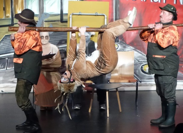 Das tut schon beim Hingucken weh: Willi Wurm (Milena Gonsior) am Haken und Rudolf Ratte (Sarah Kauder) in der Falle in der Notaufnahme der „Schwarzwildklinik“.Foto: Jacqueline Weiß